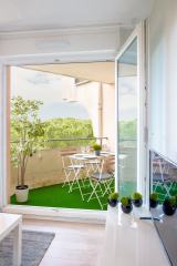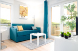 Séjour avec kitchenette équipée donnant sur balcon avec vue dégagée sur Parc; Chambre; Salle de bains avec WC.